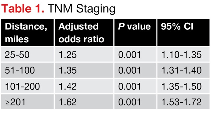 TAMPA, Fla.—The odds of presenting with metastatic or T4 colon cancer, having delayed surgical intervention and having worse mortality increased directly and linearly with distance to treatment facilities, according to new research.