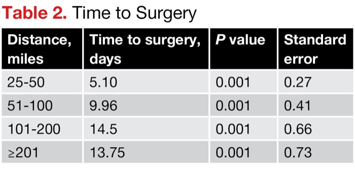 | Distance, miles | Time to surgery, days | P value | Standard error |