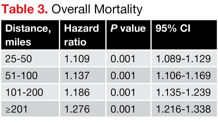 “Increased distance from a treating facility is an independent risk factor for presentation with later stages of colon cancer,” Dr. Russ said. “Time to surgery and time to adjuvant chemotherapy are increased as distance from a treating facility is increased. Patients have a stepwise decrease in overall survival as distance from treating facility increases. Efforts should be made to provide increased screening efforts and additional screening options to patients who have limited access to care.”