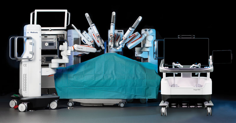 The Hugo system is made by Medtronic and consists of up to four separate carts, each with an independent arm. The arms are controlled by a surgeon seated at a console who manipulates the arms through “pistol-like” hand controllers. The carts can be moved around the OR to suit the space, procedure and patient needs.