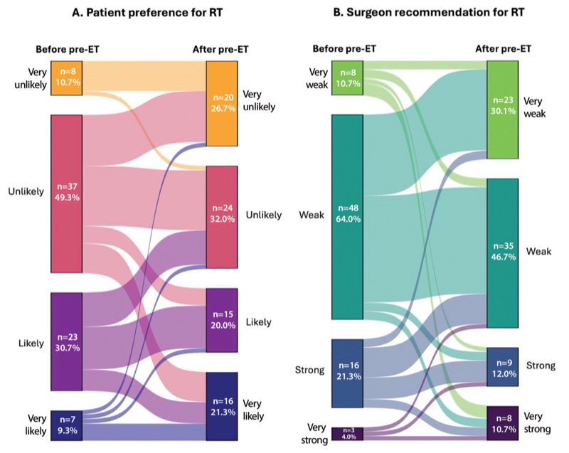 After pre-ET, 21 patients changed their preference for or against radiation, and surgeons changed their recommendation for or against radiation for 18 patients.