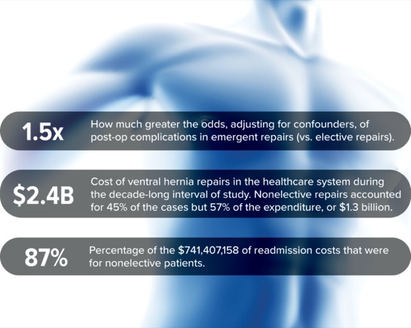 Adjusting for confounders such as comorbidities, tobacco use, hospital type, operative approach, bowel resection and other factors, they found 1.5 greater odds of postoperative complications in emergent repairs as well as higher odds of unplanned admissions and hernia recurrence.