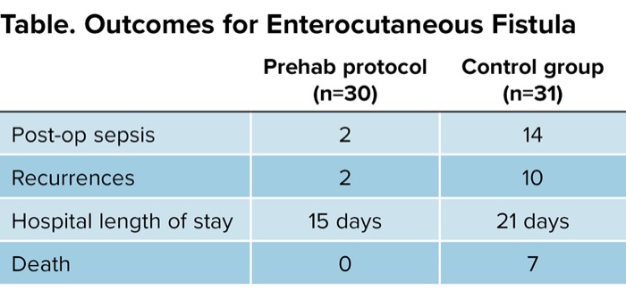 CLEARWATER BEACH, Fla.—Use of a prehabilitation protocol that emphasizes restoring good nutritional status and increasing exercise tolerance may help improve outcomes in patients undergoing surgery for enterocutaneous fistula, according to a new study.