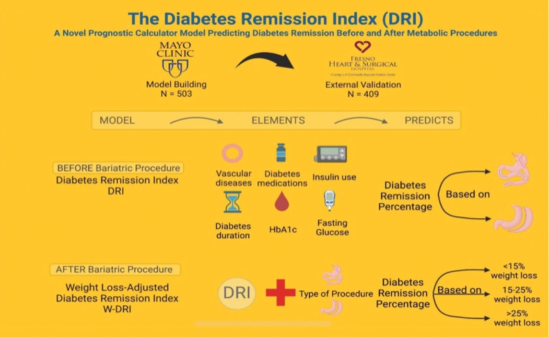 - Ghusn W, Ma P, Vierkant RA, et al. The Diabetes Remission Index (DRI): a novel prognostic calculator model predicting diabetes remission before and after metabolic procedures. Ann Surg. Published online February 4, 2025. doi:10.1097/SLA.0000000000006656