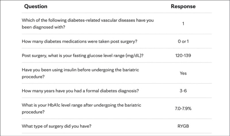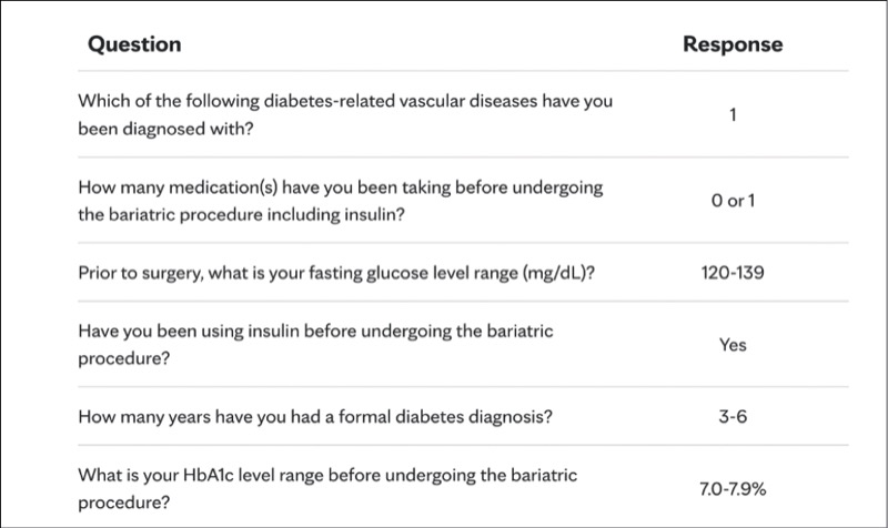 A 52-year-old woman with a five-year history of type 2 diabetes mellitus (T2D), a body mass index of 46 kg/m2, a baseline hemoglobin A1c of 7.8% and a fasting plasma glucose of 138 mg/dL is referred for evaluation for metabolic and bariatric surgery. She is currently managed on insulin alone, without any oral hypoglycemic agents. She has diabetic retinopathy but no macrovascular complications. After multidisciplinary assessment, the options of Roux-en-Y gastric bypass (RYGB) and sleeve gastrectomy are discussed. The patient and her providers are interested in understanding her individualized chances of achieving postoperative T2D remission.