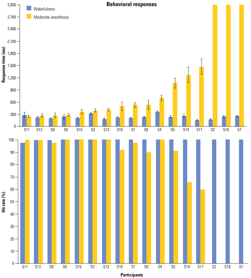 In the first study, 17 healthy participants (ages 18-40 years; 13 males) were tested in an MRI scanner during wakefulness and during the administration of propofol at dosages of moderate anesthesia. Prior to functional MRI scanning, patient variability in behavioral responsiveness was assessed using an auditory target detection task whereby participants were instructed to press a button with their index finger as soon as they heard an auditory beep through a set of headphones.