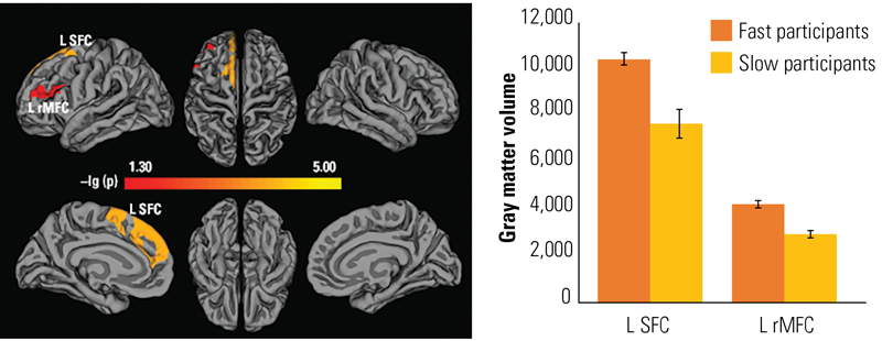 After analyzing the possible effect that each of these factors may have had on the study’s outcomes, the researchers found that interindividual differences could be explained by both structural brain differences and functional connectivity differences. Specifically, fast performers boasted significantly greater gray matter volume relative to slow participants in the left superior frontal region and dorsolateral frontal cortex, as well as the left rostral middle frontal cortex (P<0.0005 for each) (Figure 2). Perhaps not surprisingly, slow participants did not have more gray matter volume than fast participants in any brain region.