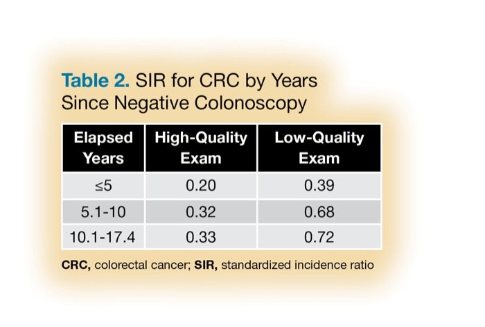 Of 265,688 men and women screened, 208,428 had a single negative exam and were followed for a median of 10.2 years, and as long as 17.4 years. Rates of CRC and mortality in patients with low-quality exams were twice as high as in those with high-quality exams, according to the researchers (Table 1). They converted the data to SIRs for three time intervals following a negative colonoscopy (Table 2).